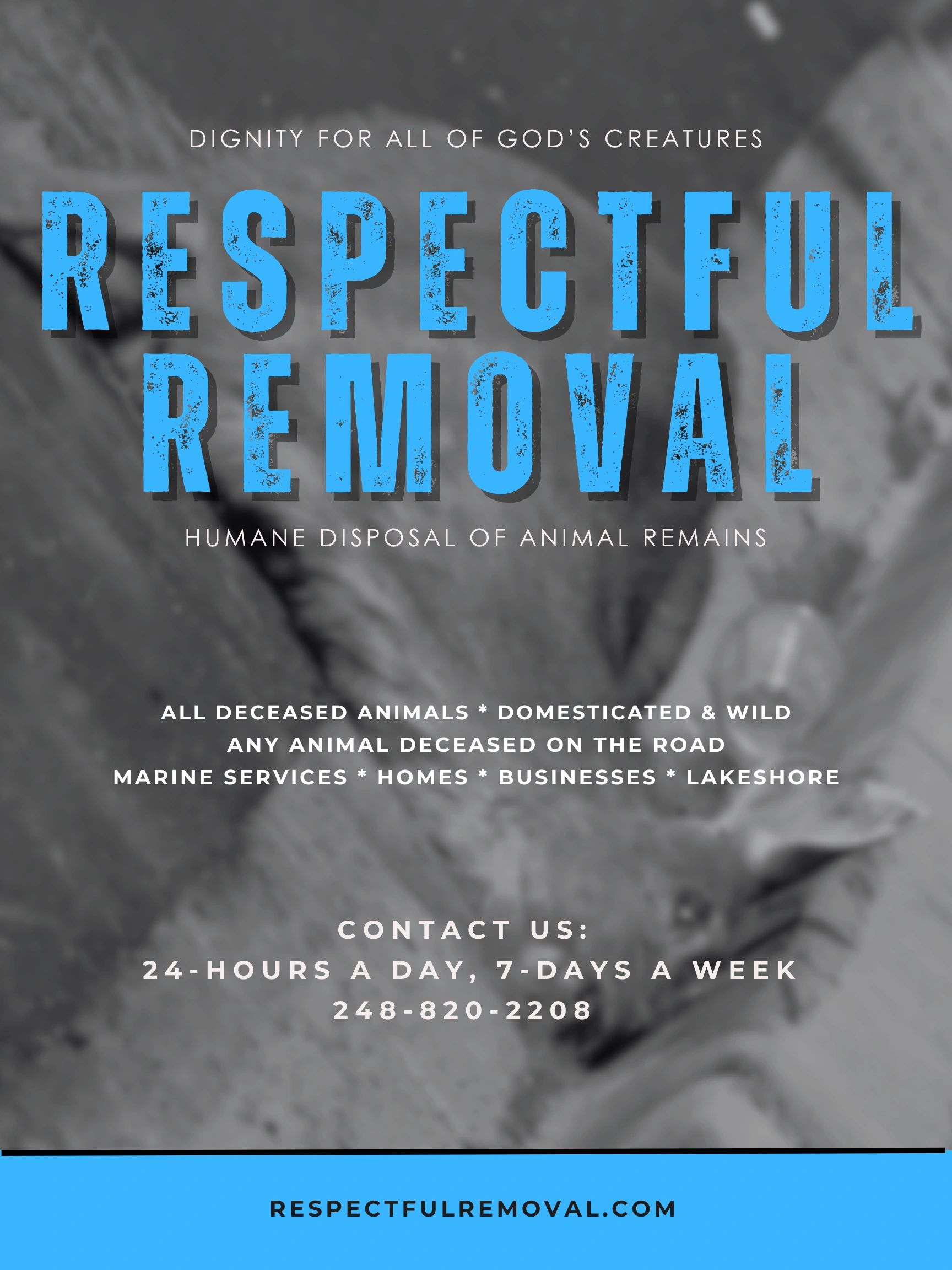 We, at Respectful Removal LLC, humbly hold it as the highest honor (as sad as it may be) to respectfully reunite a lost - now found- deceased pet with their grieving owner. We have been there and we will do everything in our power to help, I promise. We strive to always do this with dignity and compassion for your loving, faithful friend, and as many say, "member of our family."